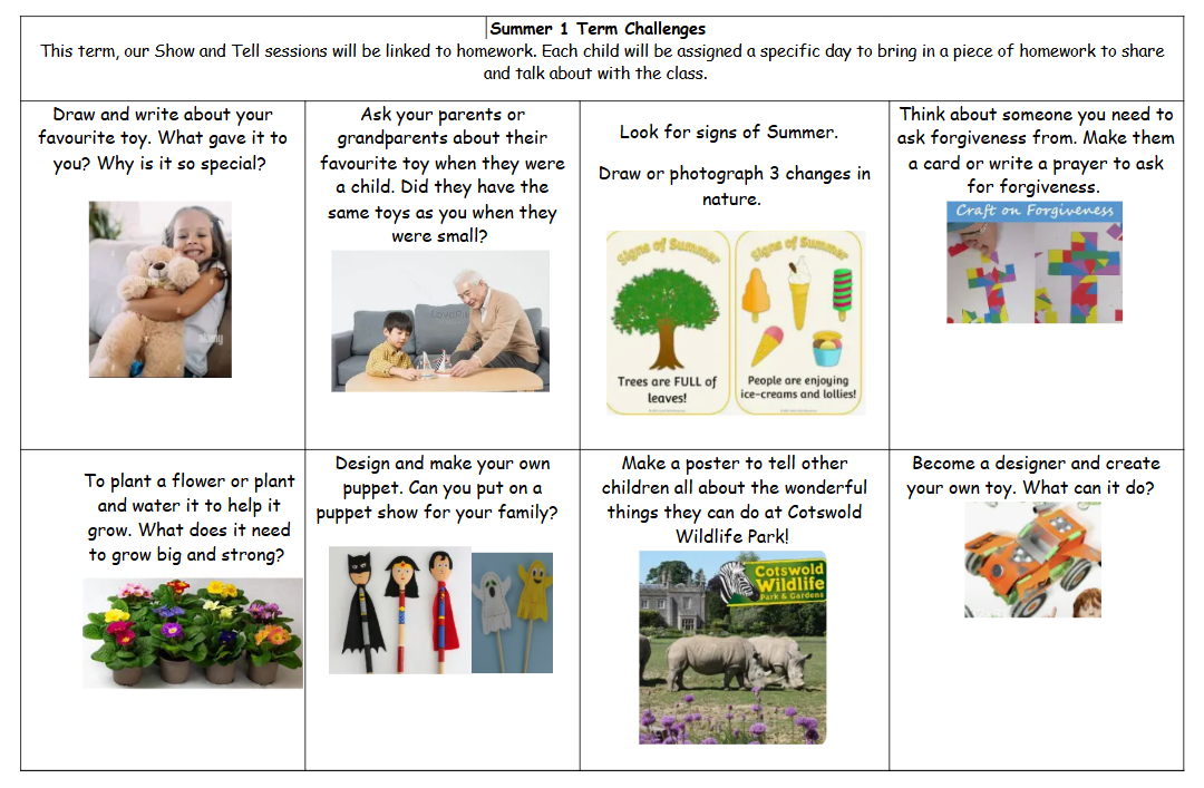 Homework will be given out each Friday and should be back in school by the following Wednesday. The children will have opportunities to showcase their homework and creativity during our Show and Tell sessions, sharing their ideas and achievements with the class.