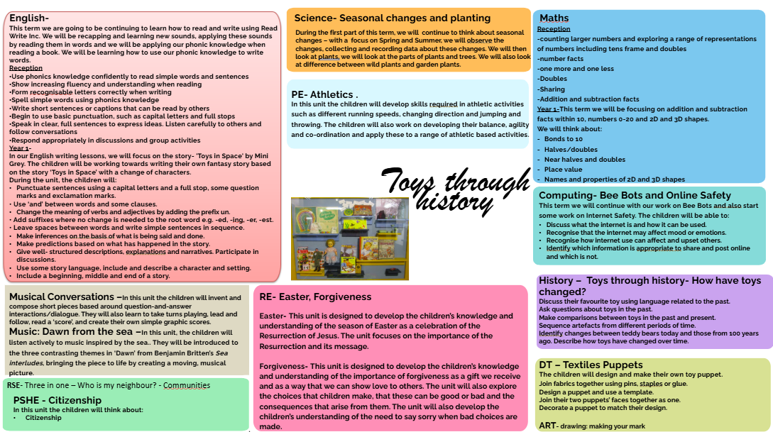 This term, our focus will be on Toys Through History. The children will explore a variety of engaging learning experiences linked to toys from the past and present, discovering how they have changed over time. We will also be thinking about how toys were made, what materials were used, and how play has developed across different generations.