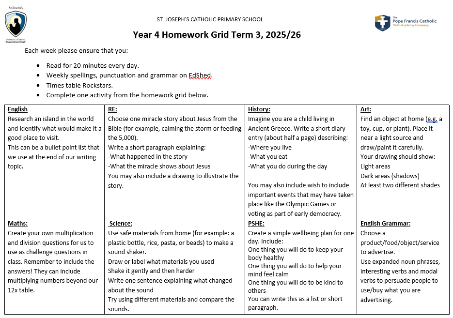 Our PE day is Monday. Homework is set on Friday due back in on Wednesdays. Homework can be found on the termly homework grid and online homework can be found on EdShed and TT Rockstars.