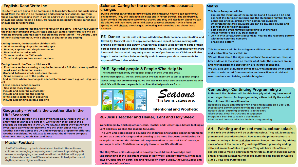 This term we will be learning all about Seasons—we will be exploring a wide range of exciting learning opportunities linked to the seasons. Learning will focus on caring for the environment and observing seasonal changes, especially the signs of spring and the weather in the UK.