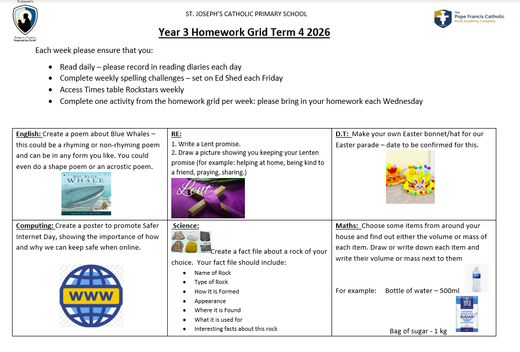 Homework will be given out each Friday and should be back in school by the following Wednesday - there is a copy on this page and a paper copy will be given out with homework folders.
