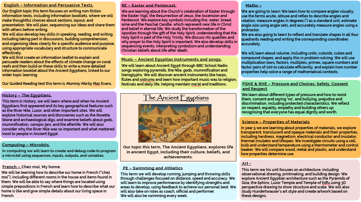This term, Year 5 will have our PE lesson on a Friday, and swimming will take place every Thursday. Please can your child come to school in their PE kit or swimming costume under their uniform on these days.