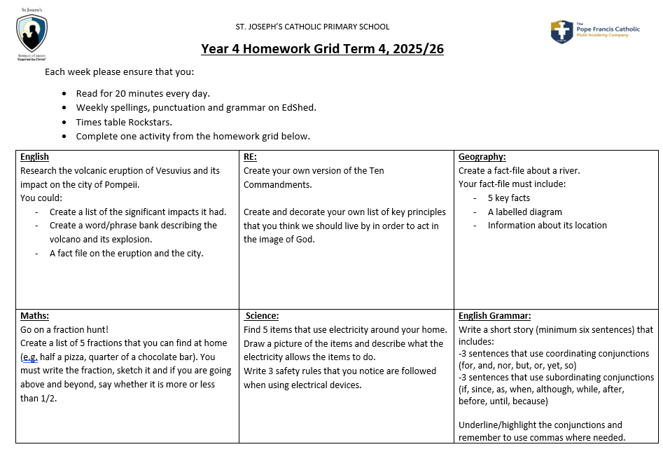 Our PE day is Monday. Homework is set on Friday due back in on Wednesdays. Homework can be found on the termly homework grid and online homework can be found on EdShed and TT Rockstars.